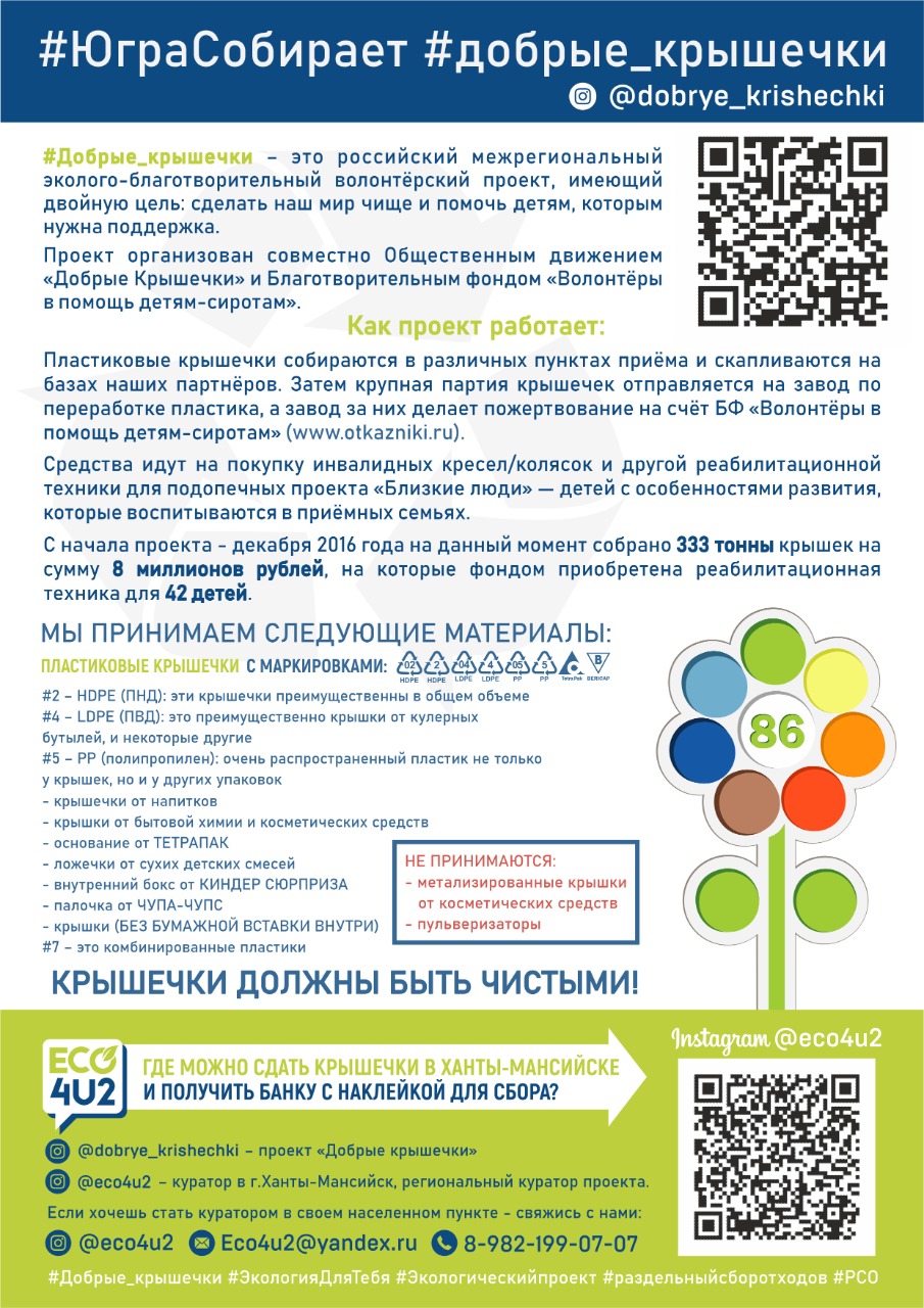 «Добрые крышечки» – это российский эколого-благотворительный волонтерский проект, имеющий двойную цель: сделать наш мир чище и помочь детям, которым нужна поддержка.