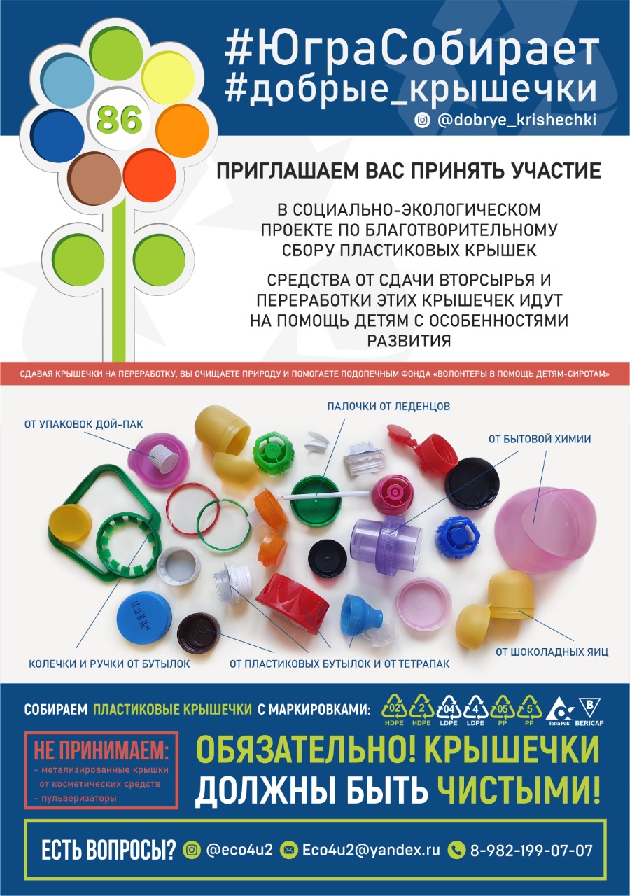 С декабря 2020 года в Югре было собрано и отправлено на переработку 6 733 кг пластиковых крышечек - 140 тысяч рублей было переведено во всероссийский фонд "Волонтеры в помощь детям-сиротам". Казалось бы, ерунда. Но благодаря именно единству всех регионов-участников, в России - это 45 регионов (152 города), четыре ребенка с ОВЗ из городов: Ханты-Мансийск, Нягань, Нефтеюганск и Когалым Ханты-Мансийского автономного округа получили дорогостоящее реабилитационное оборудование.