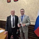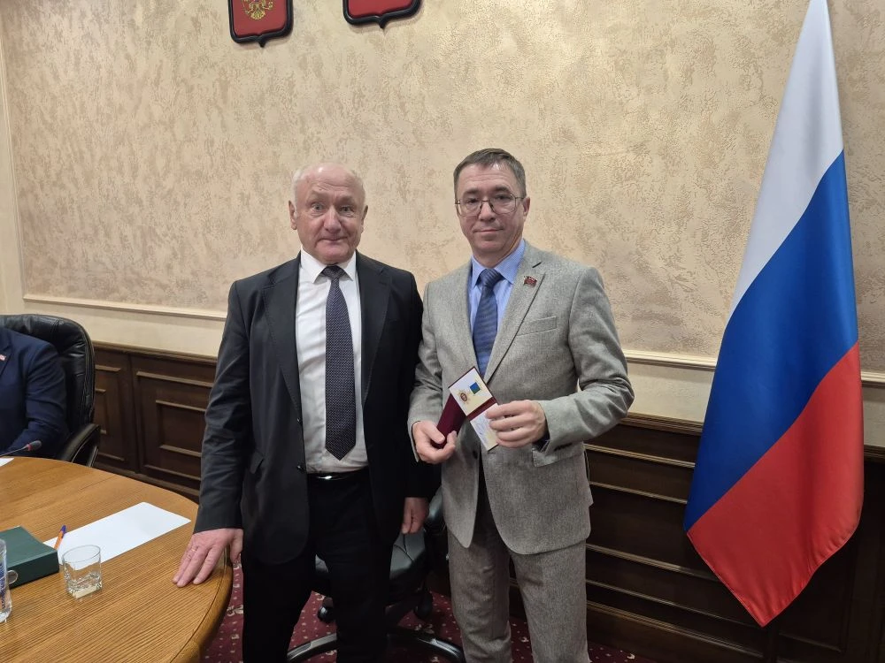 Вначале Сергей Маненков вручил депутату Думы Юрию Юрьевичу Громовому  почетный нагрудный знак «За вклад в развитие законодательства» Думы Югры Поздравил с заслуженной наградой.