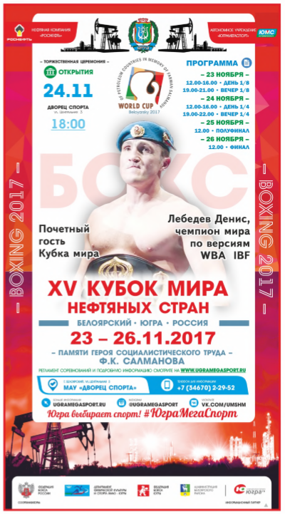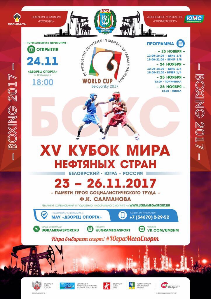 24 ноября в Белоярском состоялось официальное открытие Кубка мира нефтяных стран по боксу памяти Героя социалистического труда Фармана Салманова. Участников и гостей приветствовали глава Белоярского района Сергей Маненков, епископ Югорский и Няганский Фотий, директор департамента физической культуры и спорта Югры Игорь Губкин, техделегат международной ассоциации любительского бокса Пётр Винник.