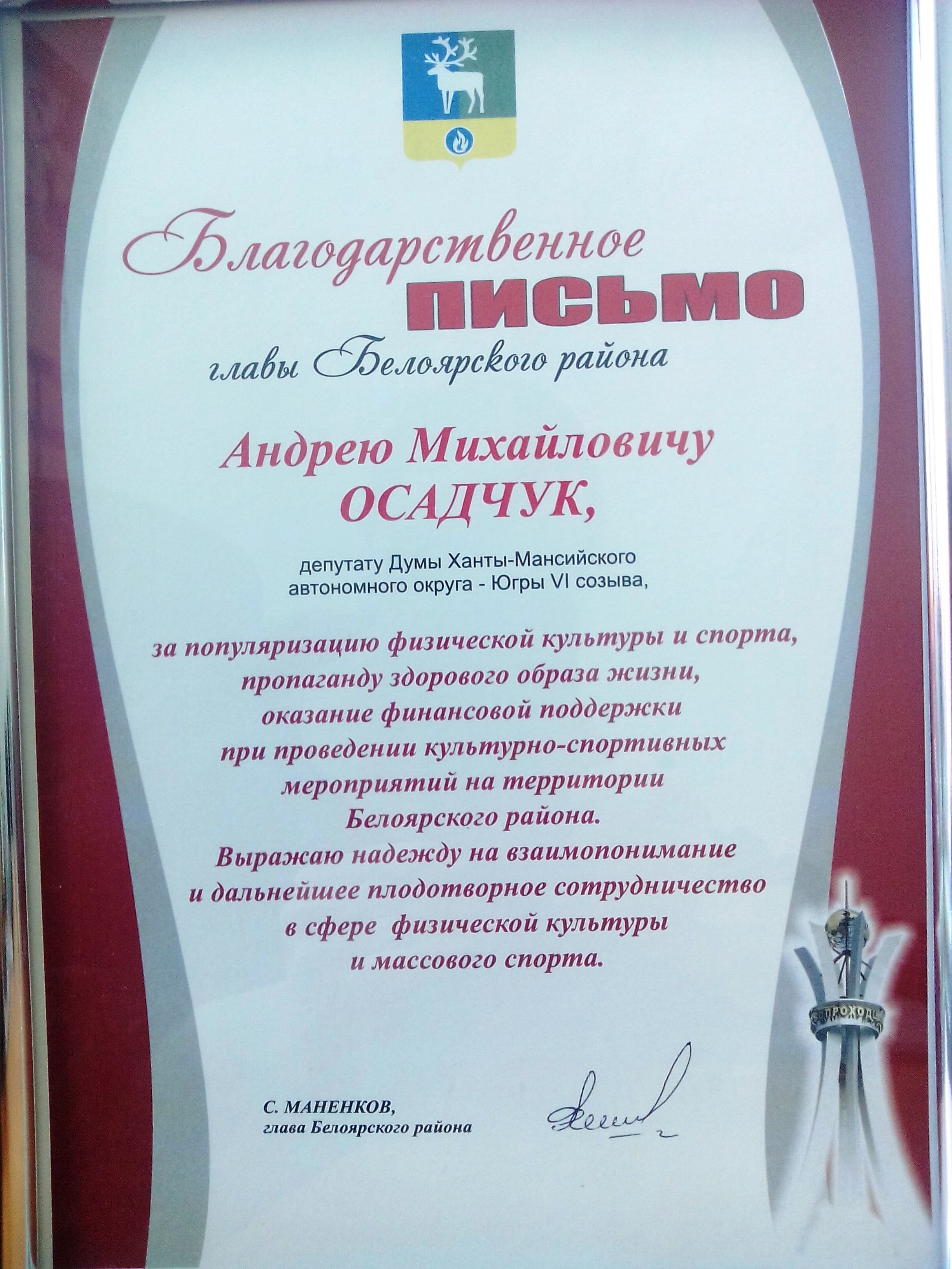 Благодарственным письмом главы Белоярского района отмечена деятельность депутаты Думы ХМАО-Югры Андрея Осадчука. Сергей Маненков отметил значительность вклада регионального парламентария в популяризацию физической культуры и спорта в муниципалитете, выразил надежду на дальнейшее плодотворное сотрудничество в развитии района.