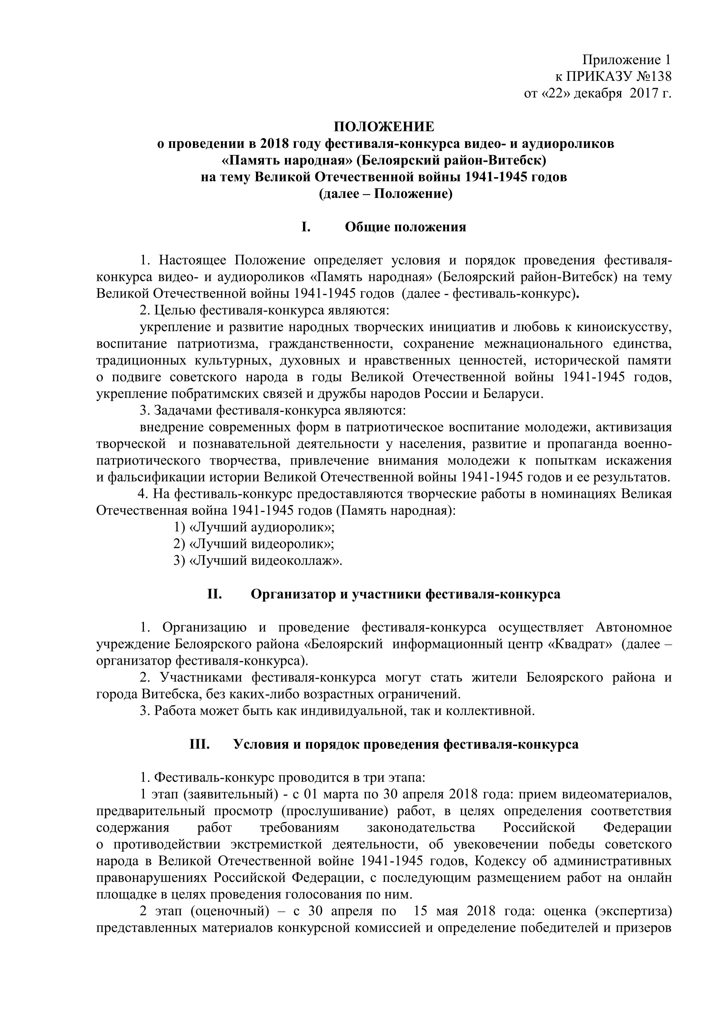 Белоярский информационный центр «Квадрат» объявляет международный конкурс аудио- и видеороликов «Память народная» на тему Великой Отечественной войны.Фестиваль конкурс проводится в сотрудничестве с представителями Беларуси в рамках побратимских отношений Белоярского и Витебска.