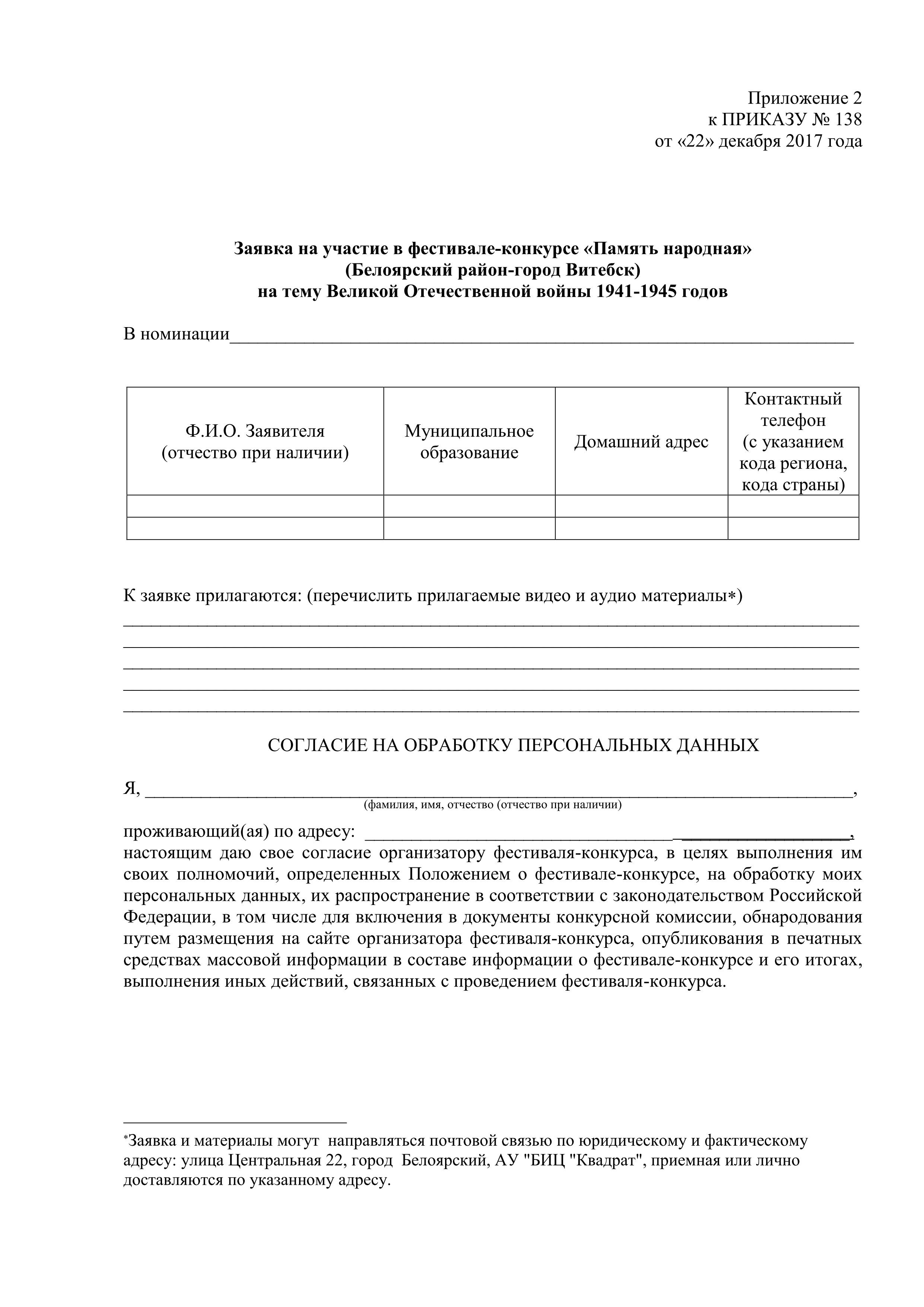 Чтобы стать участником, необходимо не позднее 30 апреля 2018 года предоставить свою творческую работу в адрес организатора – Белоярского информационного центра «Квадрат» по адресу: ул. Центральная, д. 22. К работе прилагается заявка.