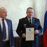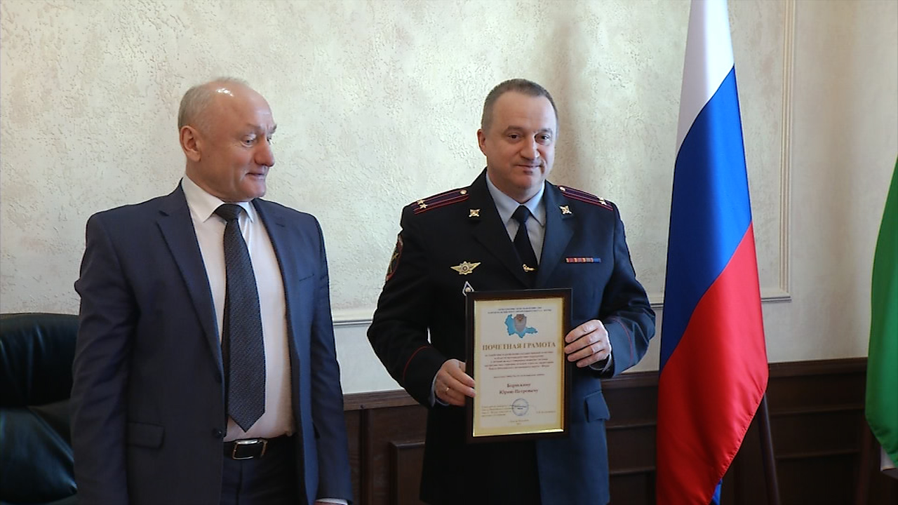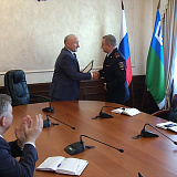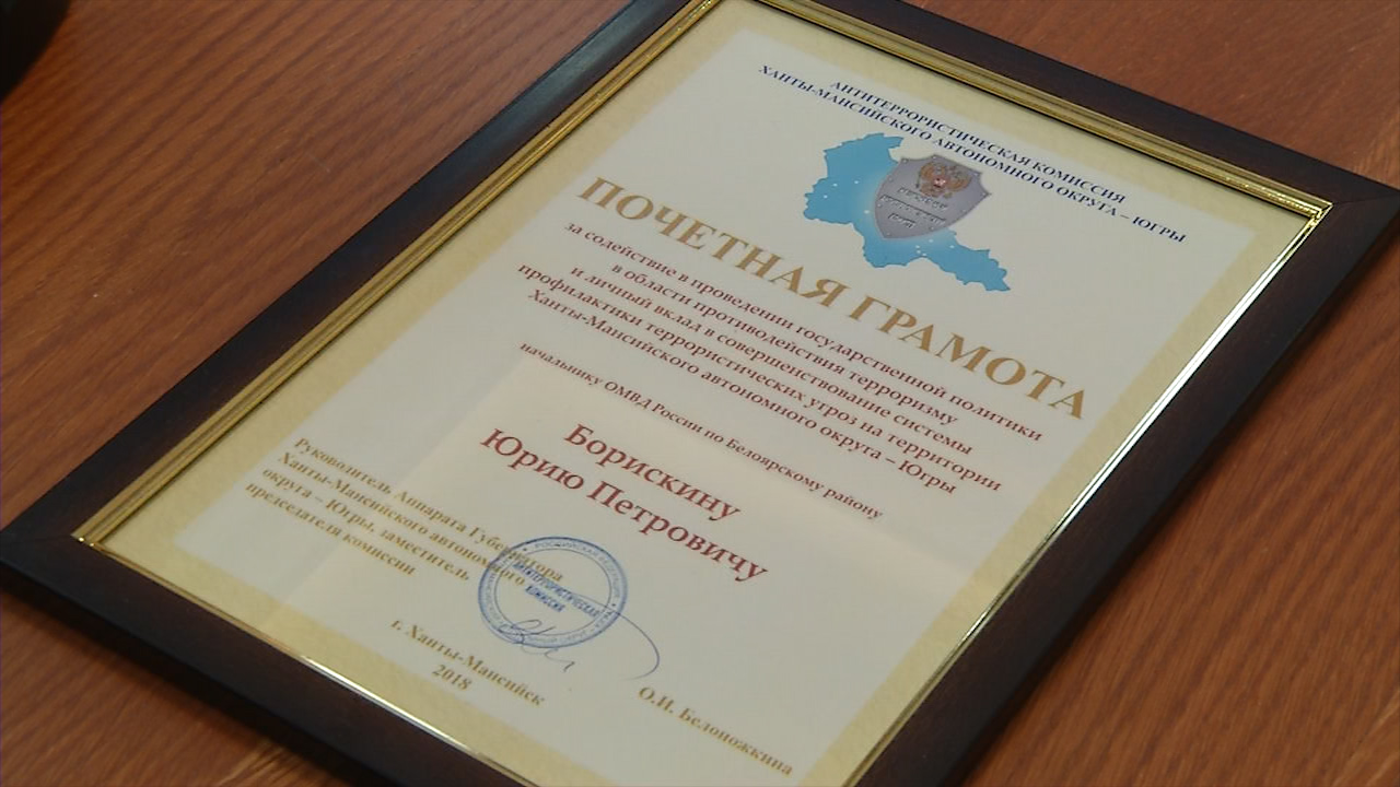 Сергей Маненков от имени руководителя аппарат губернатора Югры Ольги Белоножкиной вручил Почетную грамоту Антитеррористической комиссии региона начальнику ОМВД России по Белоярскому району Юрию Борискину за содействие в проведении государственной политики в области противодействия терроризму.