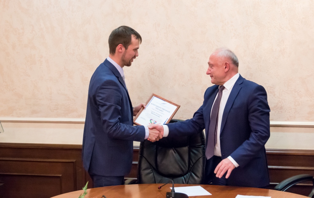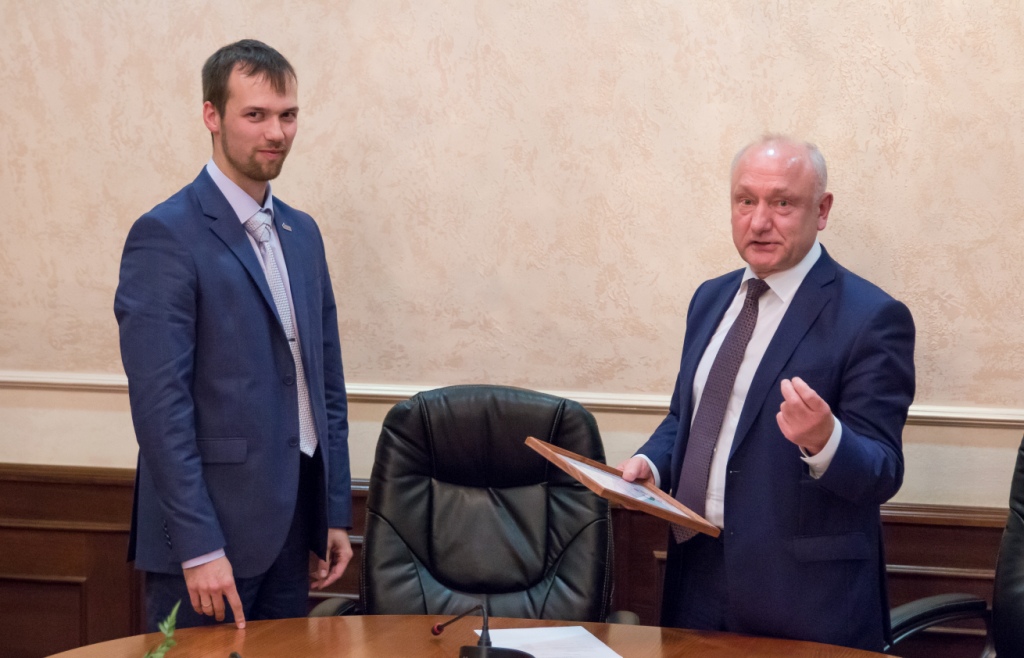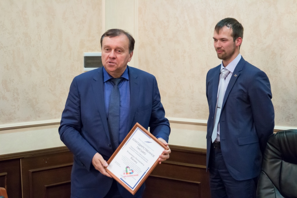 Артем Калугин от лица общественной молодежной палаты вручил благодарственные письма за поддержку во всех начинаниях главе Белоярского района Сергею Маненкову, представителям Комитета по делам молодежи, физкультуре и спорту районной администрации, коллективу Совета депутатов городского поселения Белоярский третьего созыва в лице его председателя Владимира Васика и Белоярскому информационному центру «Квадрат».