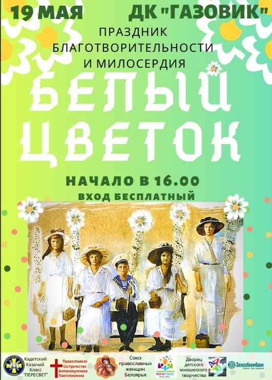 Местная некоммерческая общественная организация Белоярского района "Союз православных женщин Белоярья" сообщает, что 19 мая в г.Белоярский состоится Праздник благотворительности и милосердия “Белый цветок”, который входит в План мероприятий Белоряского района, посвященных Году Семьи в ХМА-Югре.