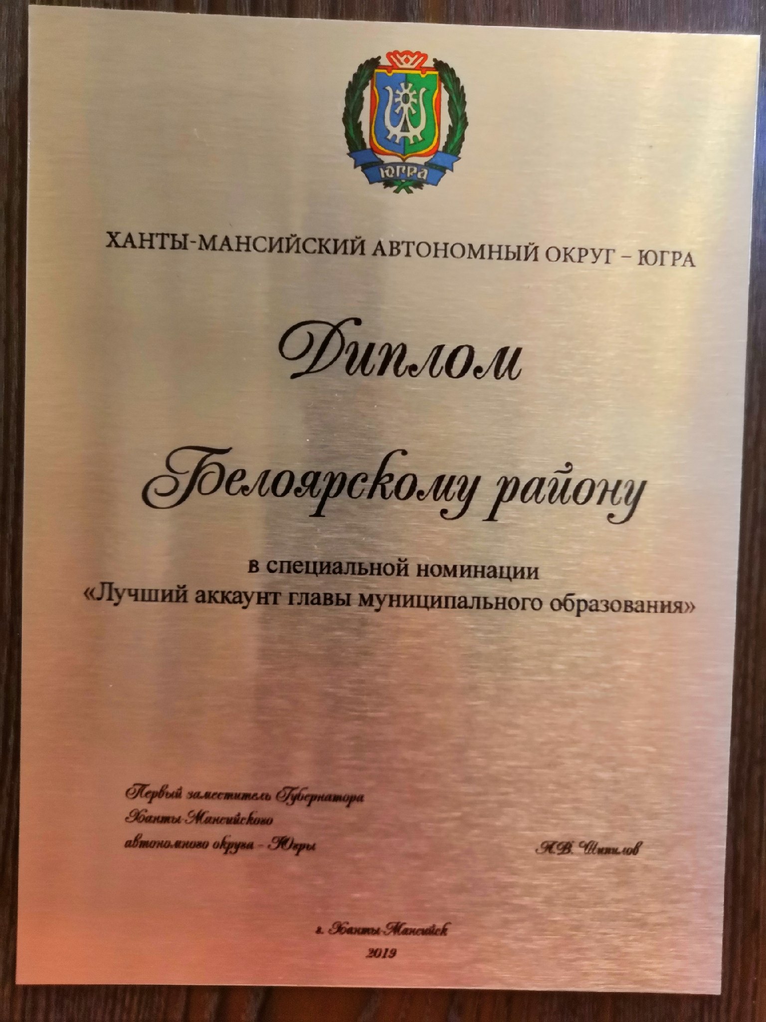 Белоярский район награжден Дипломом «Лучший аккаунт главы муниципального образования» за подписью первого заместителя губернатора региона Алексея Шипилова.
