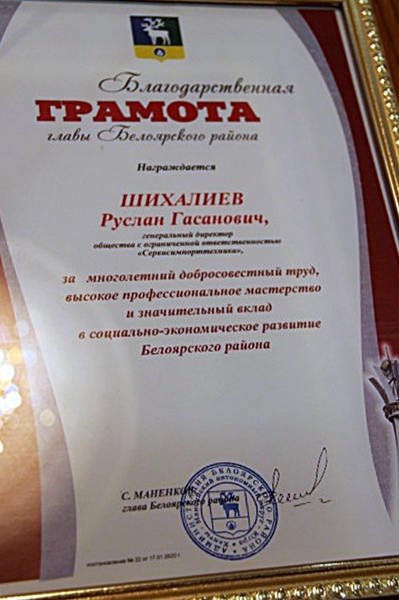 Глава муниципалитета Сергей Маненков сегодня на аппаратном совещании вручил Благодарственную грамоту главы Белоярского района Руслану Шихалиеву, генеральному директору ООО «Сервисимпорттехника», депутату Совета депутатов городского поселения Белоярский, за многолетний добросовестный труд, высокое профессиональное мастерство и вклад в социально-экономическое развитие территории.