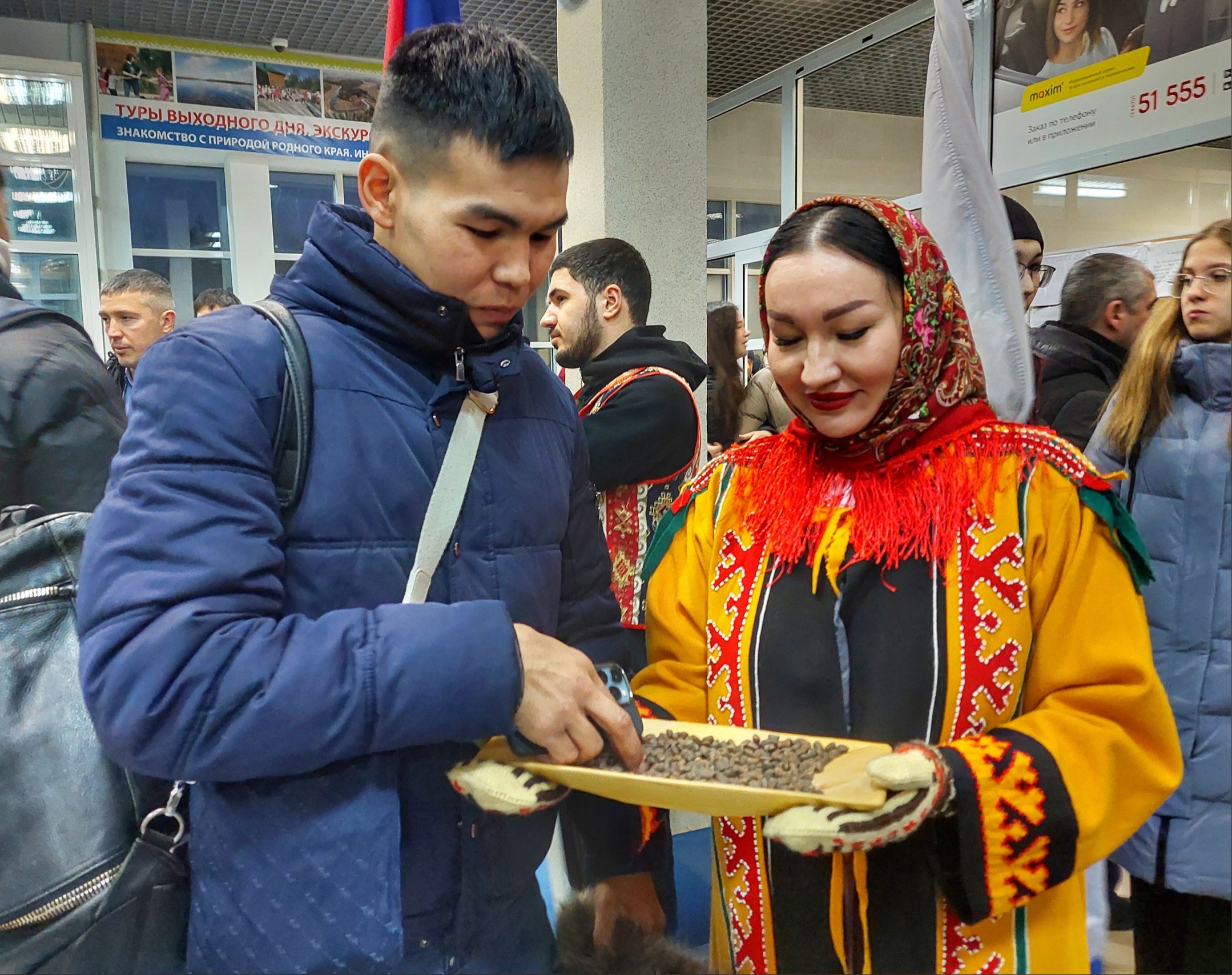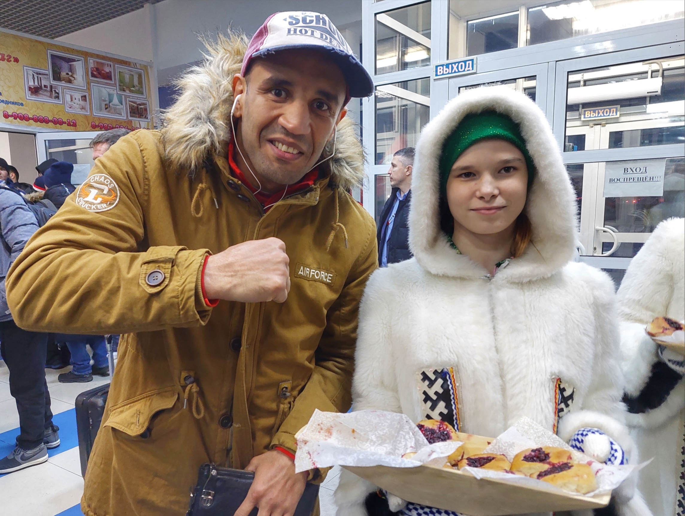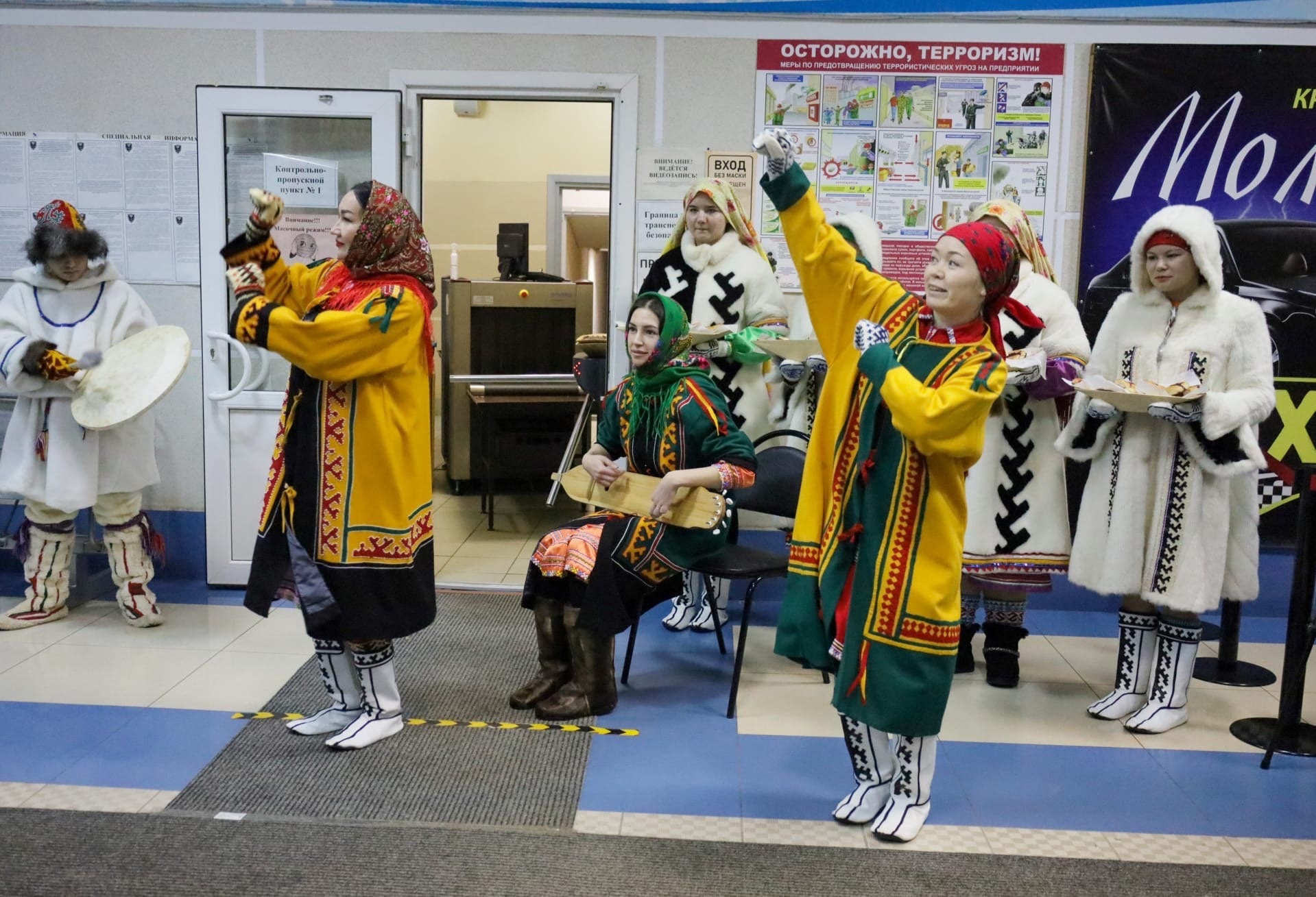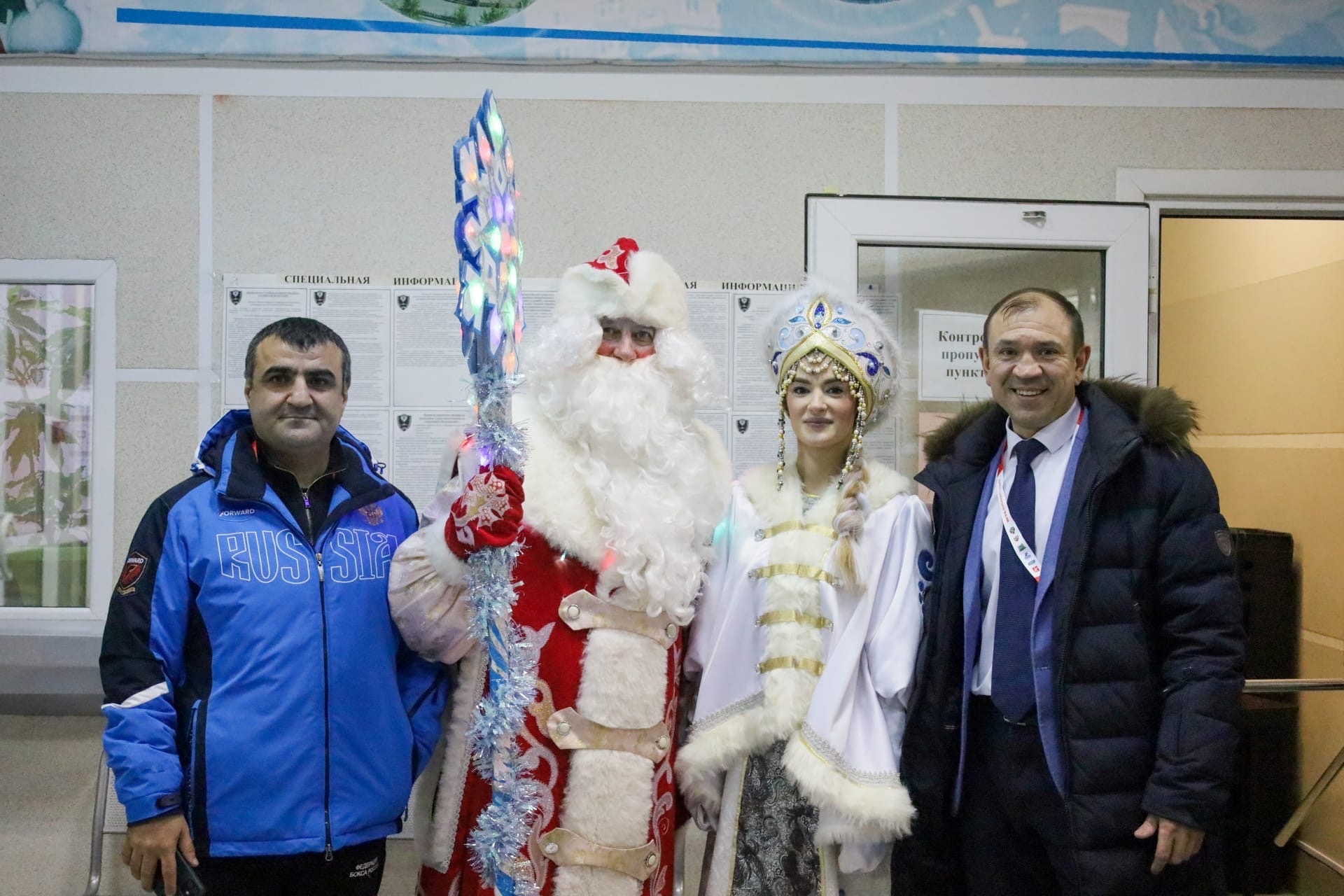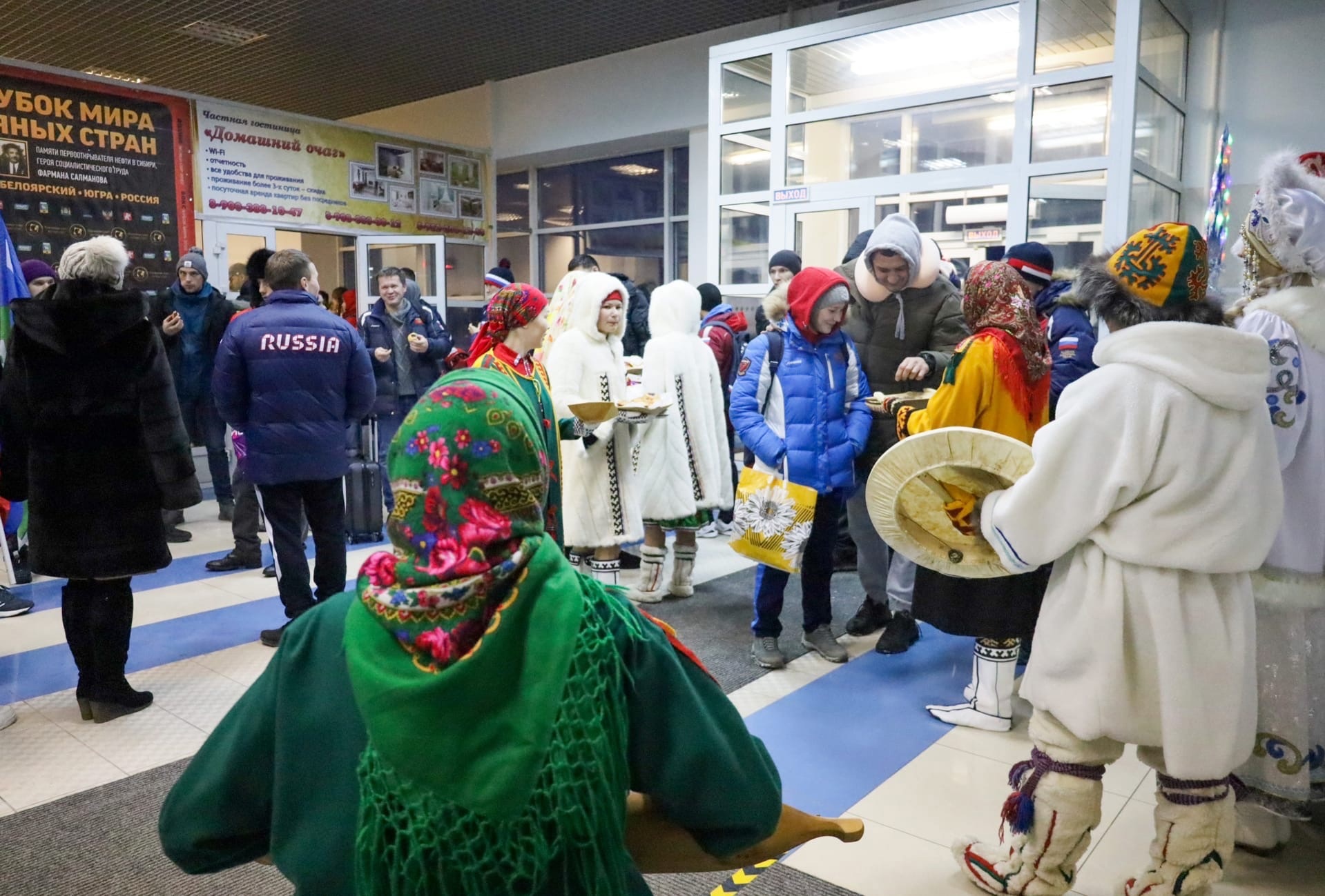 В первый день в аэропорту города поприветствовали участников соревнований народный самодеятельный коллектив «Увас Хурамат», что в переводе означает «узоры севера», Дед Мороз и Снегурочка. Гости турнира послушали завораживающие мелодии бубна и санквылтапа - мансийских музыкальных инструментов и попробовали традиционные народные угощения: кедровые орехи и булочки с брусникой.