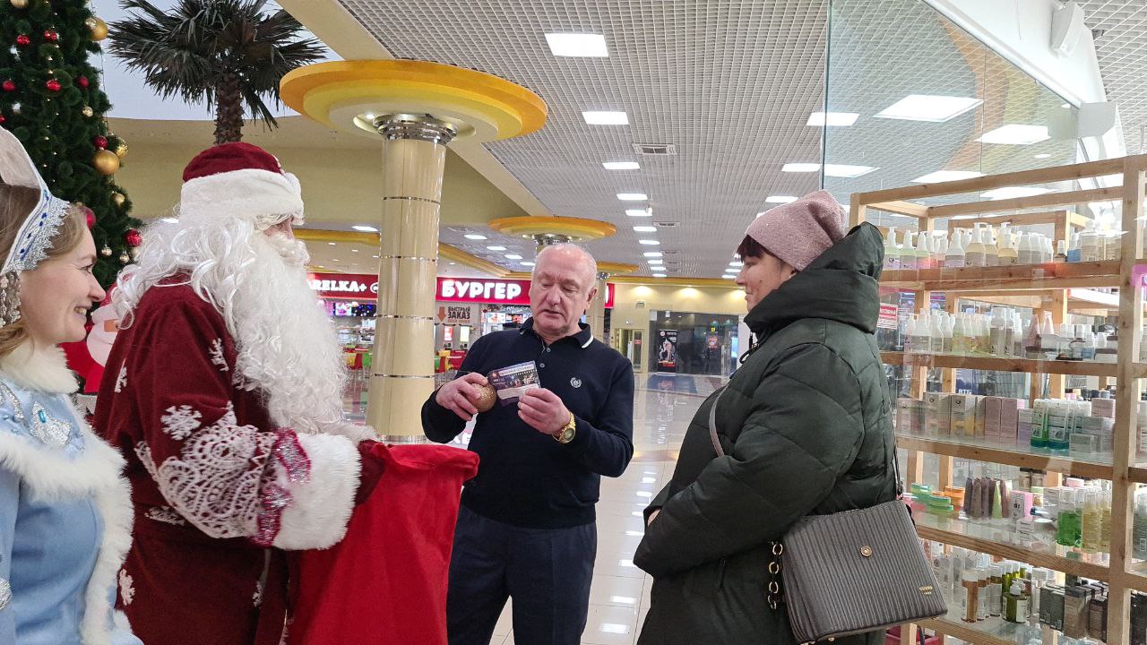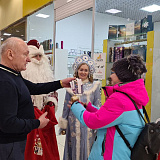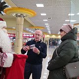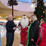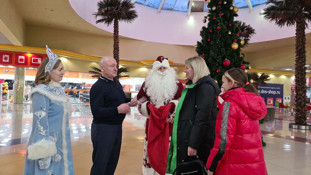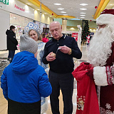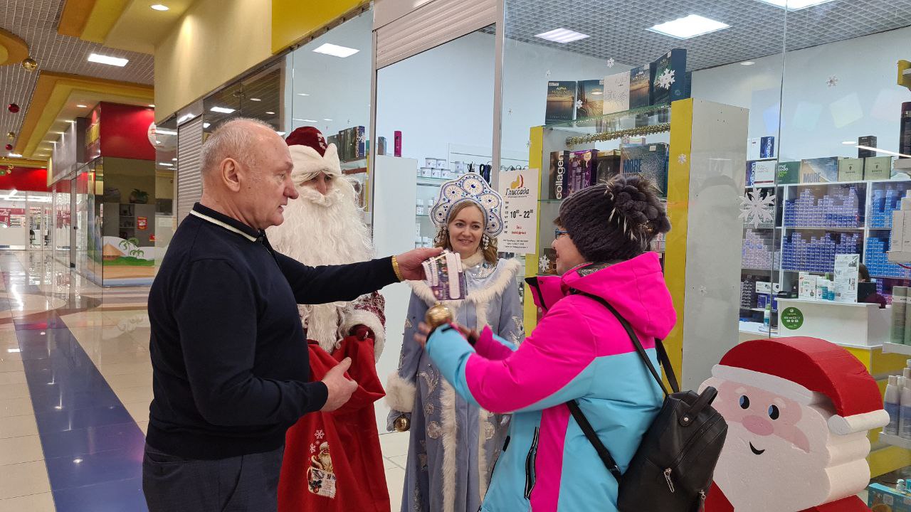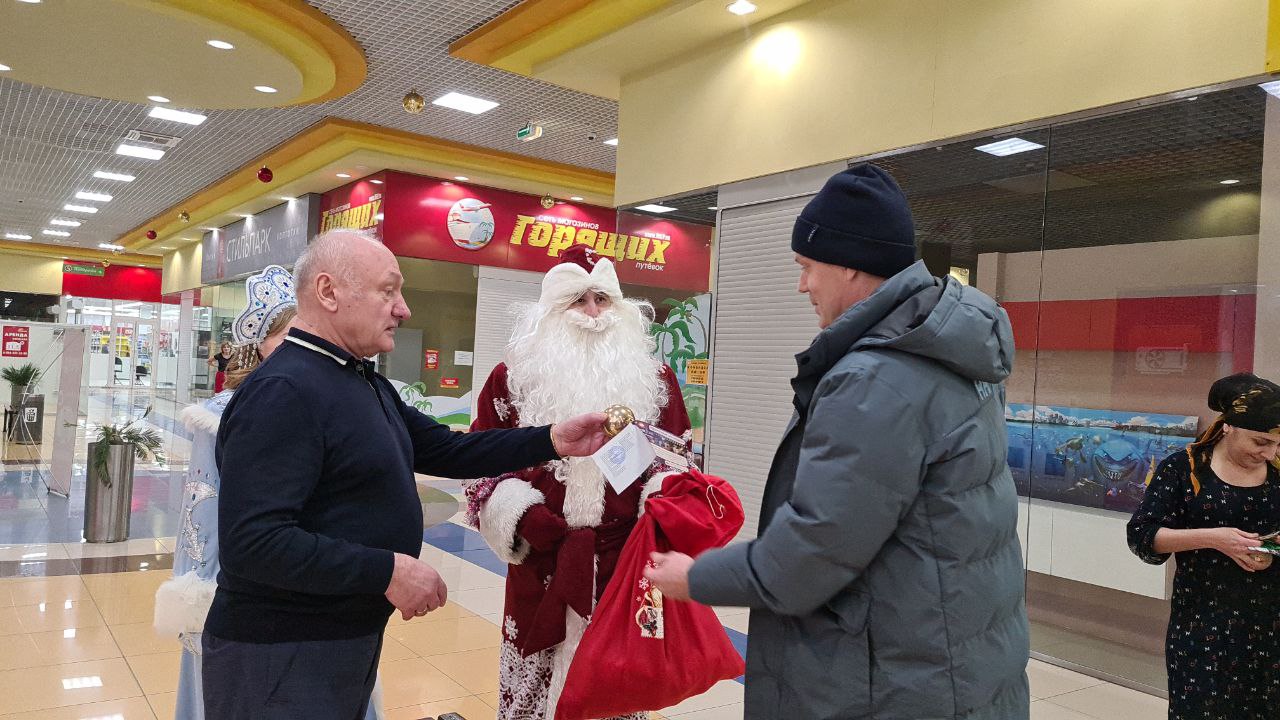 Вместе с Дедом Морозом и Снегурочкой Сергей Маненков поздравил с наступающими праздниками земляков, которых встретил в ТРЦ «Оазис Плаза». и подарил новогодние шары и билеты в кинотеатр «Синема Де Люкс»