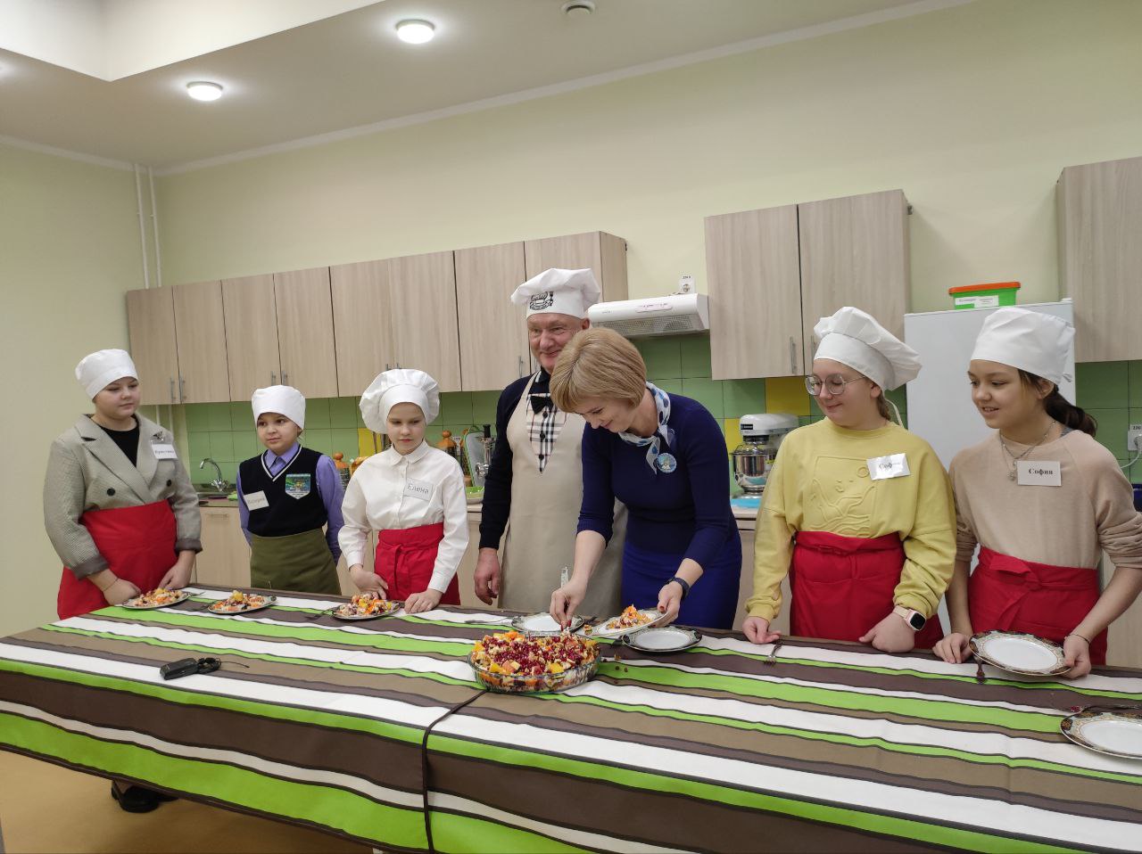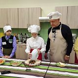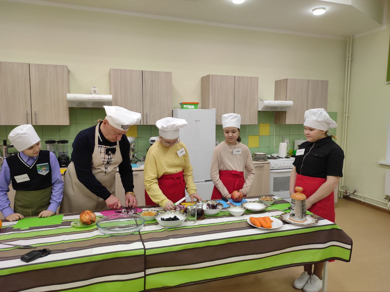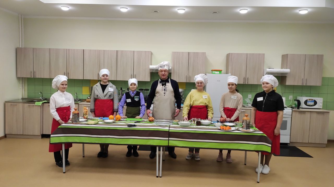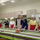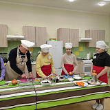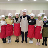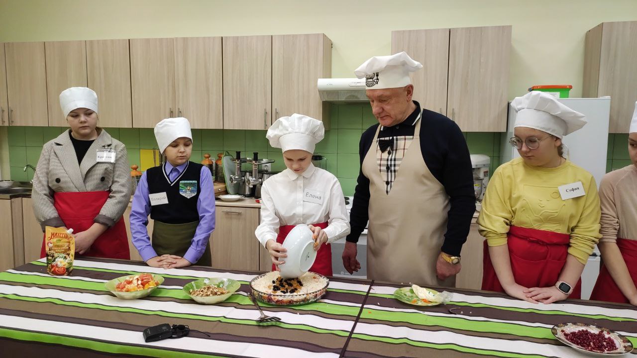Глава муниципалитета рассказал, как сделать вкусный праздничный салат. Раскрыл секреты мастерства: объяснил ученикам, как правильно резать ингредиенты для салата, какие лучше продукты использовать. Дети активно задавали вопросы.