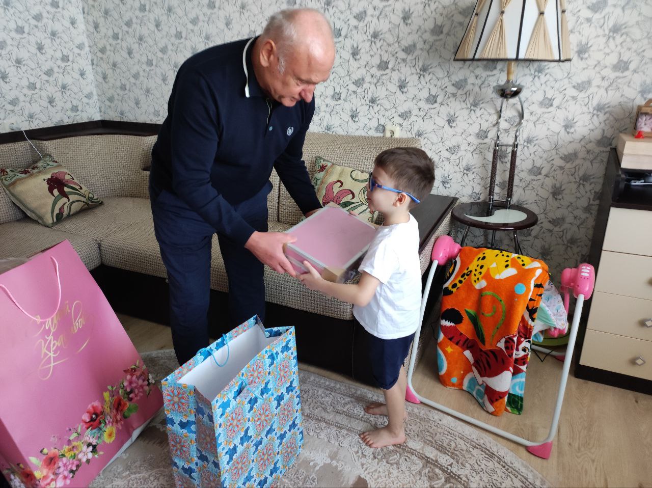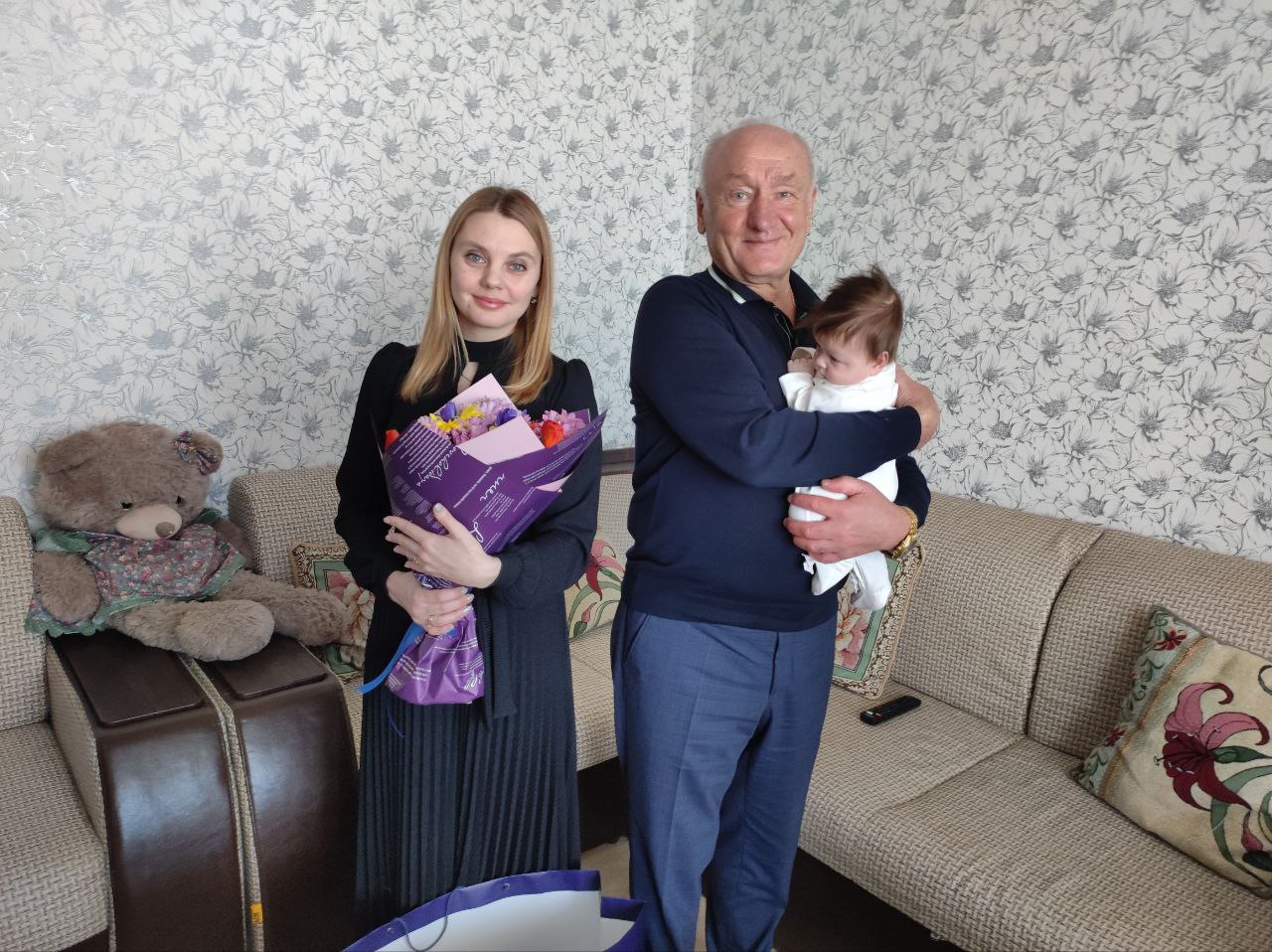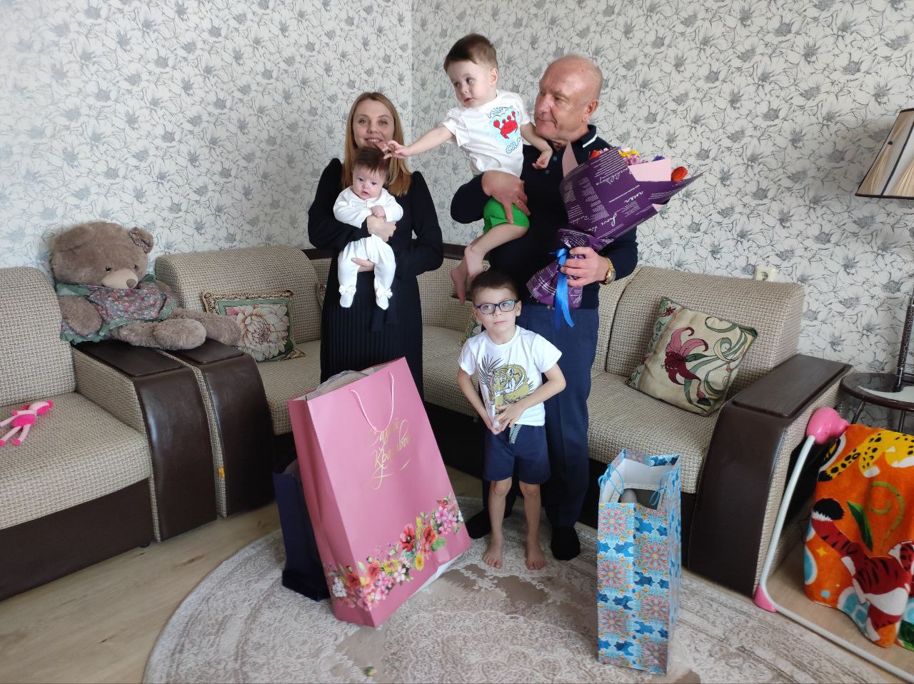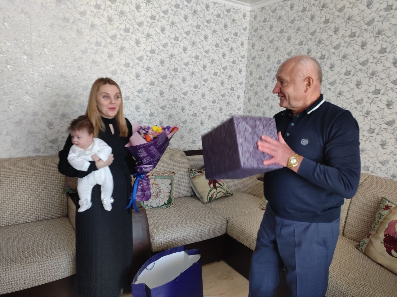 Сергей Маненков пожелал Алине всего самого наилучшего. Здоровья, радости, весеннего настроения в душе и доме, улыбок и цветов. Вручил подарок Алине и ее трем деткам. Выразил слова поддержки.