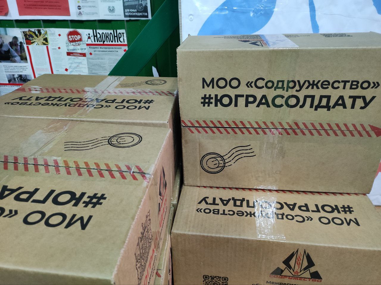 Собрано более 70 коробок с патриотичной надписью #СвоихНеБросаем, куда вошли товары первой необходимости и продукты питания для жителей новых субъектов РФ и военнослужащих, участвующих в СВО.