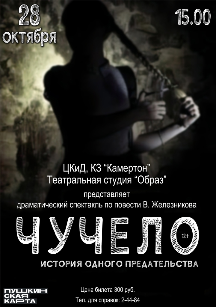 Приобретайте билеты в кассе ЦКиД, КЗ «Камертон» с понедельника по пятницу с 14.00 до 17.00 и на сайте: https://vmuzey.com/event/spektakl-po-povesti-v-zheleznikova-chuchelo.