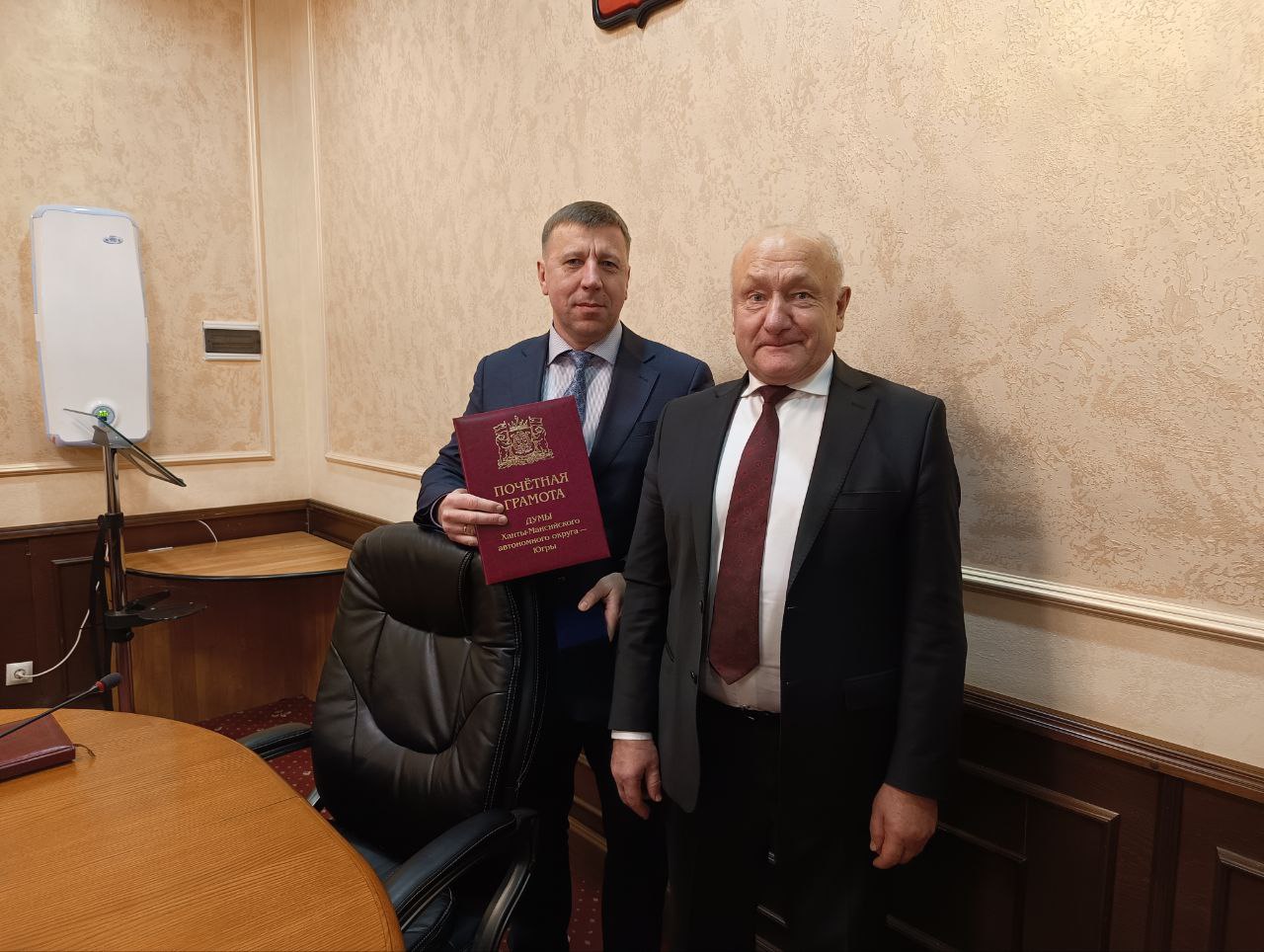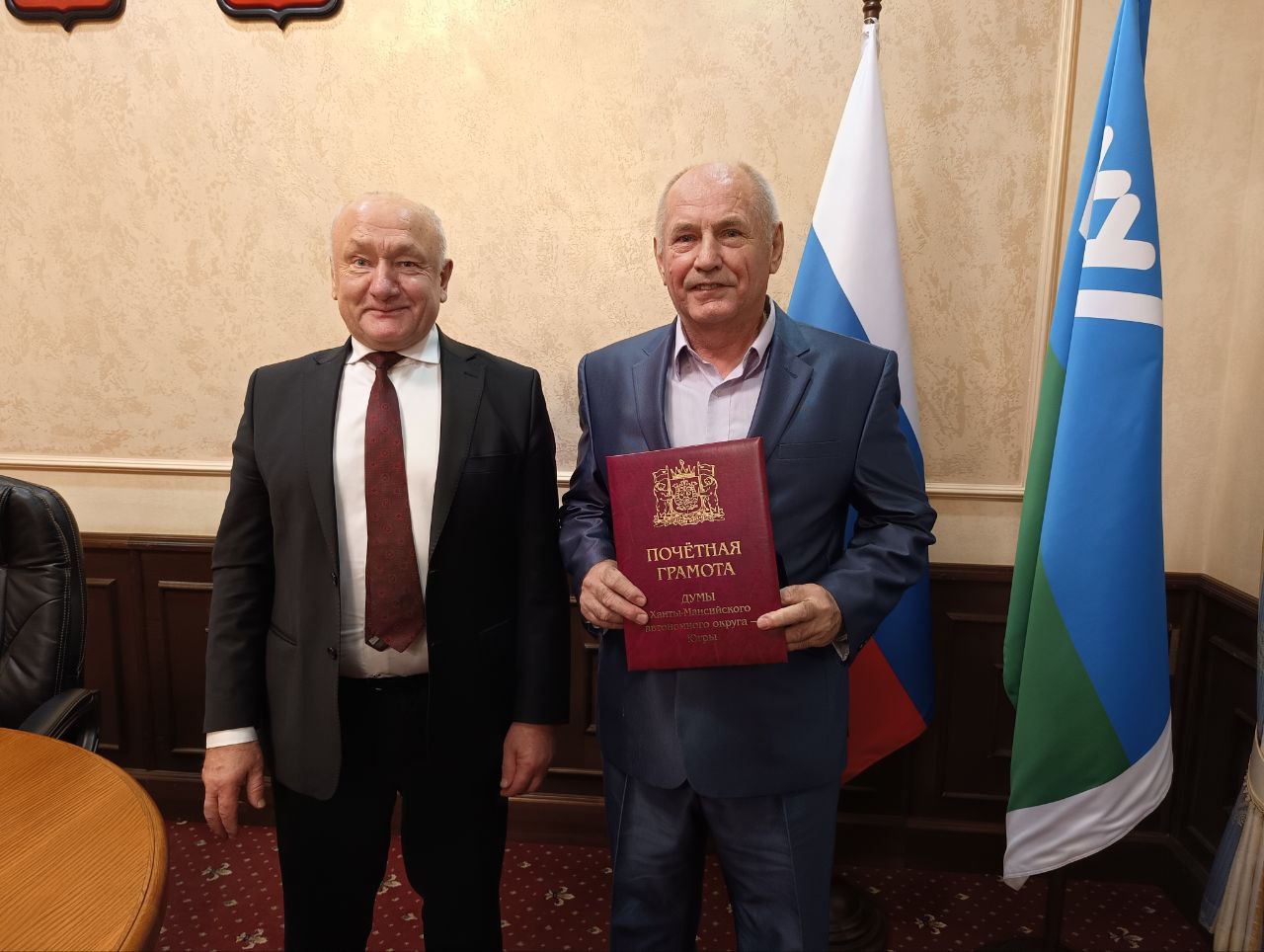 Глава территории вручил награды Думы Югры первому заместителю главы Белоярского района Александру Валерьевичу Ойнецу и пенсионеру, члену местной общественной организации ветеранов войны и труда города Белоярский Николаю Прокопьевичу Бешкильцеву за многолетний эффективный труд на благо района и округа.