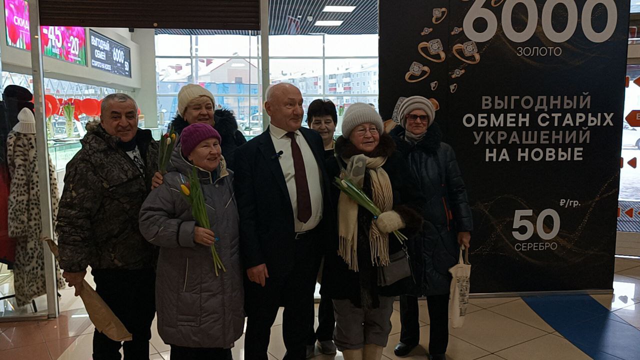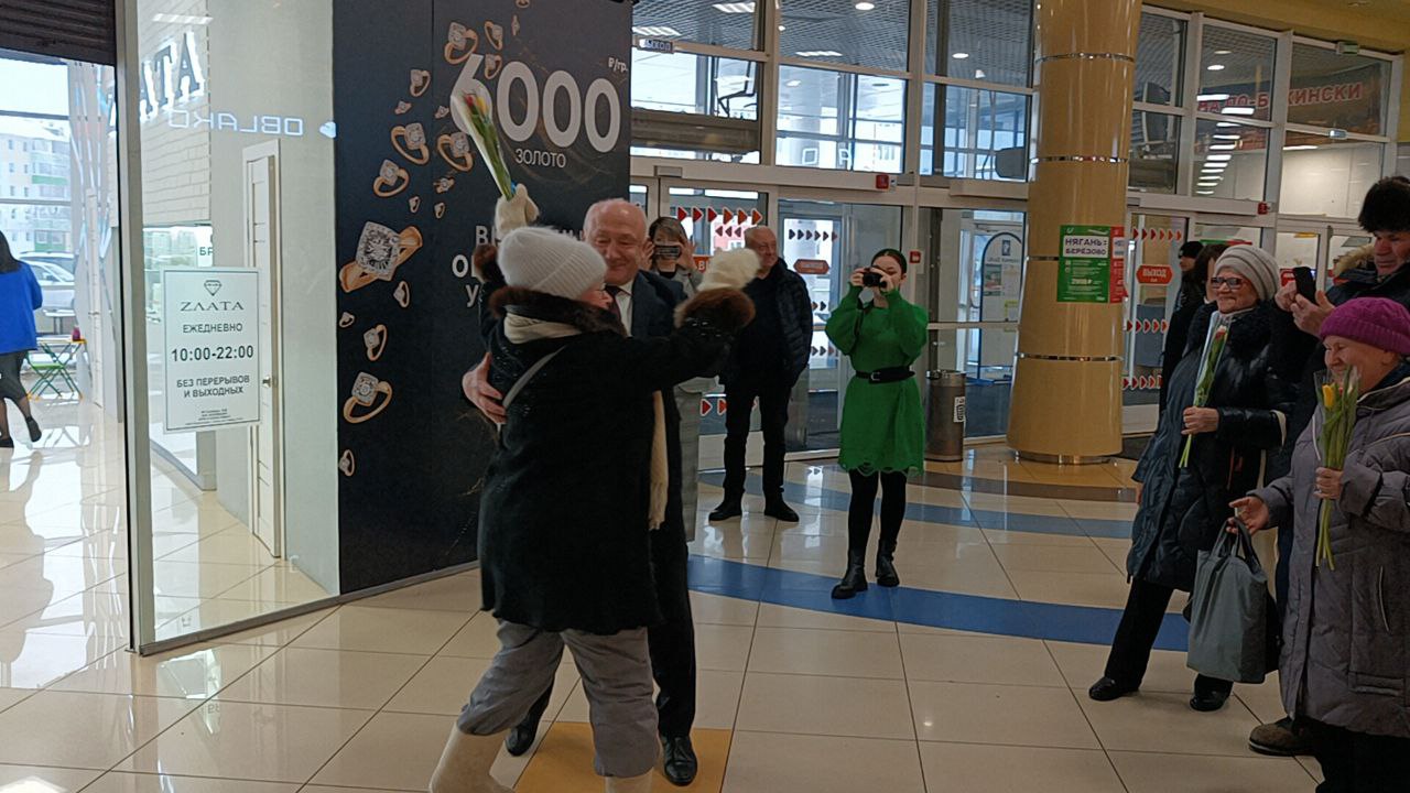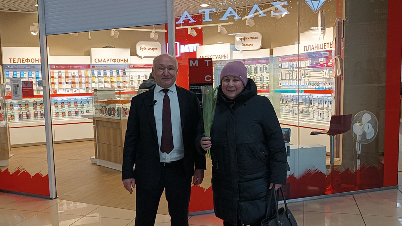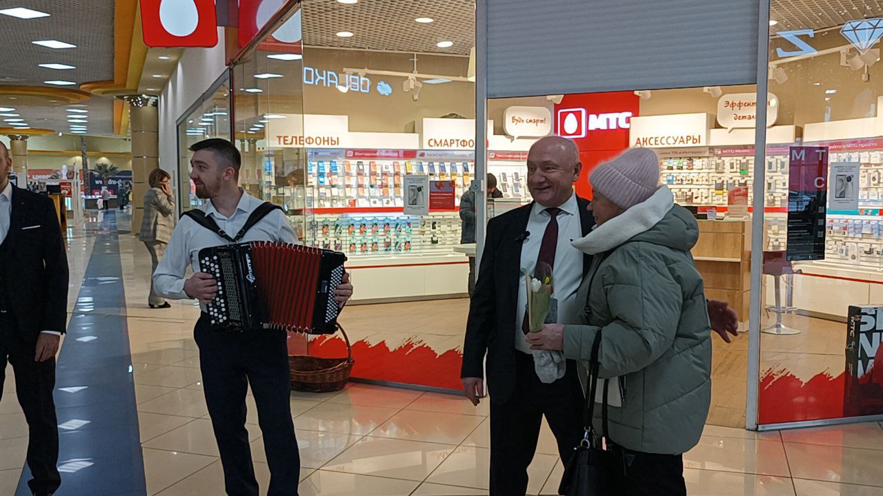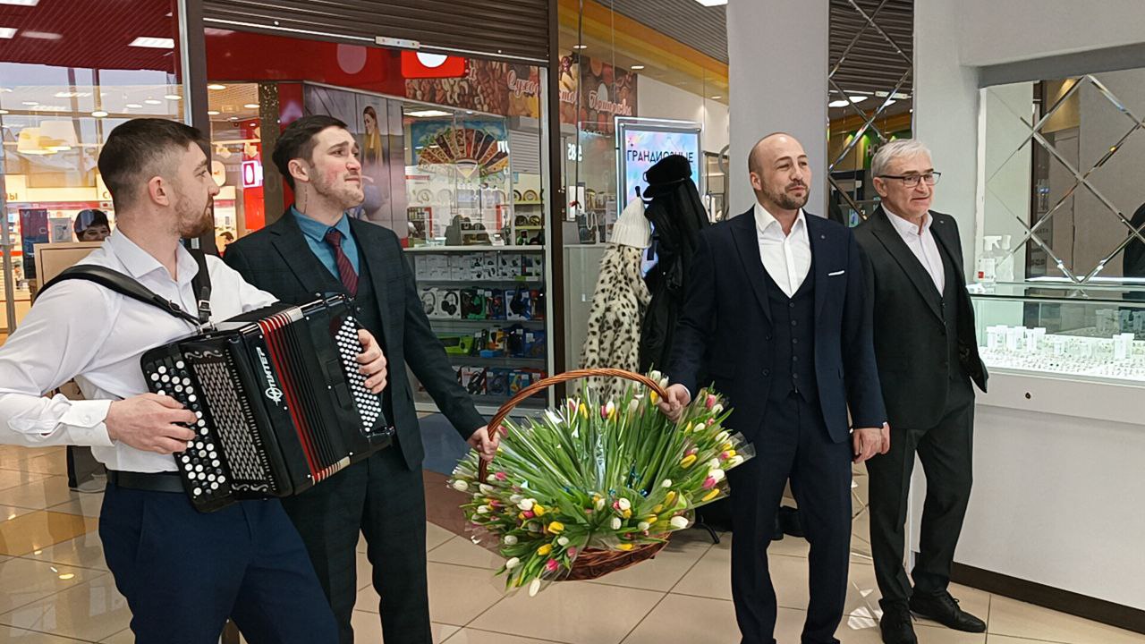 Вместе с участниками художественной самодеятельности Сергей Маненков раздал весенние тюльпаны представительницам женского пола, которых встретил в ТРЦ «Оазис Плаза», поздравил с наступающим праздником и пожелал много красивых слов.