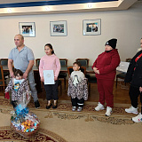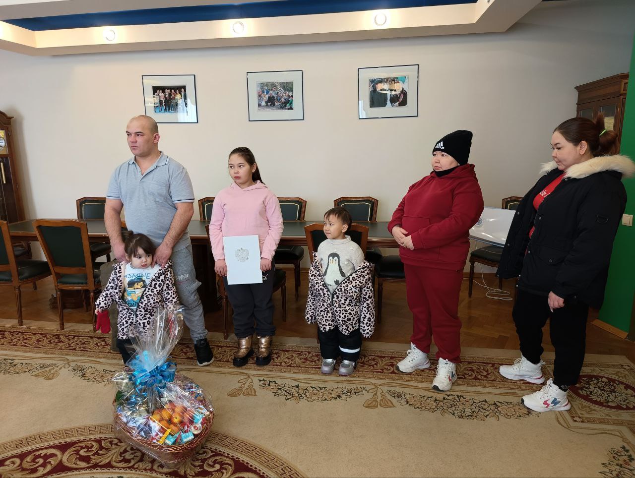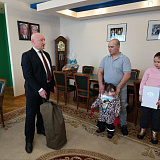 Военнослужащий получил рюкзак со специальным обмундированием. Детям глава района подарил корзину с фруктами и сладостями.