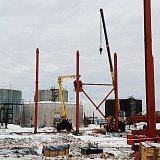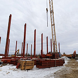 На сегодняшний день на объекте завершены работы по погружению свай под здание новых ВОС. Завершены работы по устройству железобетонных фундаментов под колонны здания. Ведутся работы по монтажу каркаса здания.