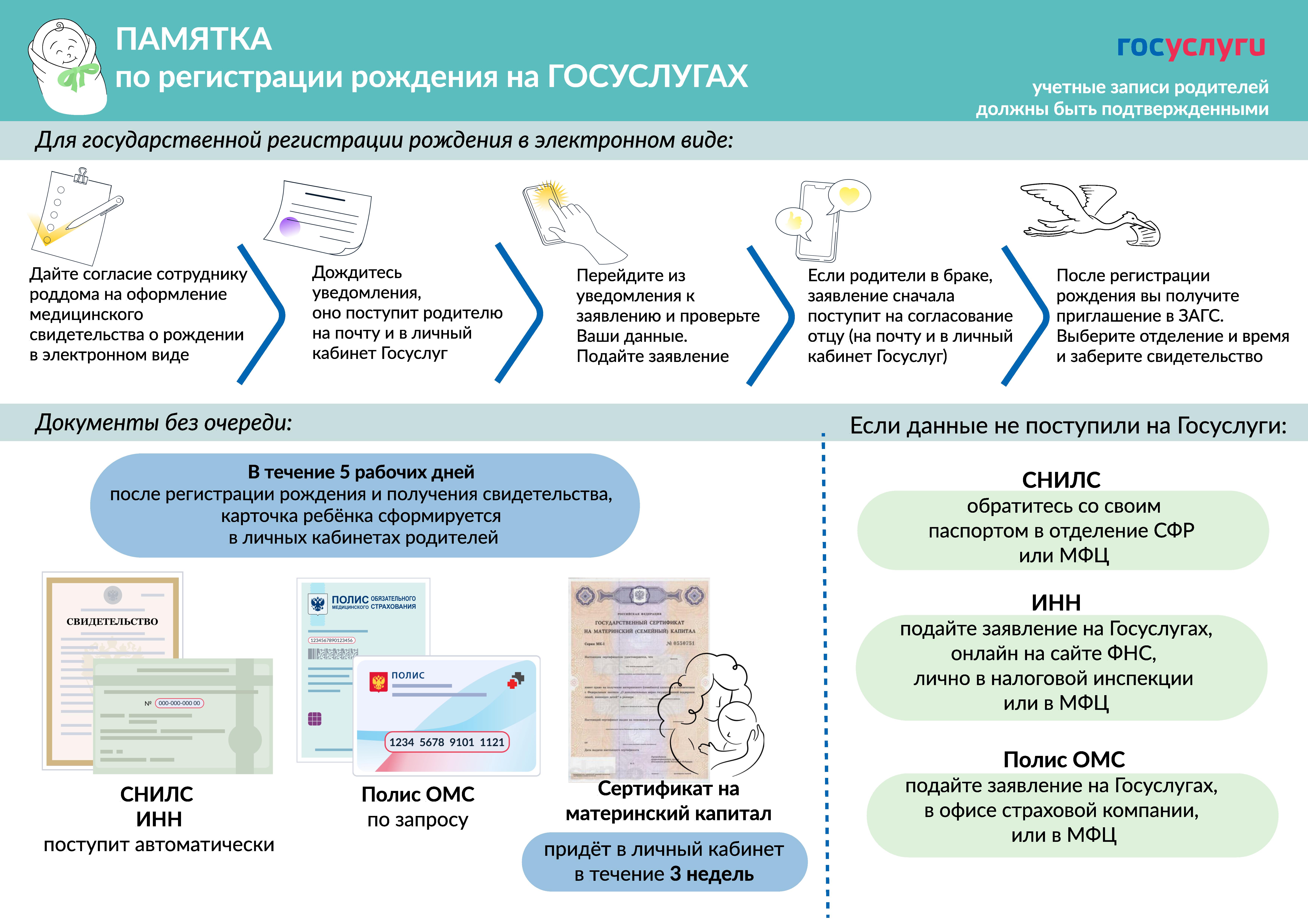 На федеральном портале Госуслуг открыт суперсервис «Рождение ребёнка». С его помощью родители могут оформить все самые важные документы для малыша: подать заявление на государственную регистрацию рождения, прописать его по месту жительства, оформить ИНН, СНИЛС, полис ОМС новорождённого, прикрепить ребёнка к поликлинике, подать заявления на получение мер социальной поддержки и многое другое.