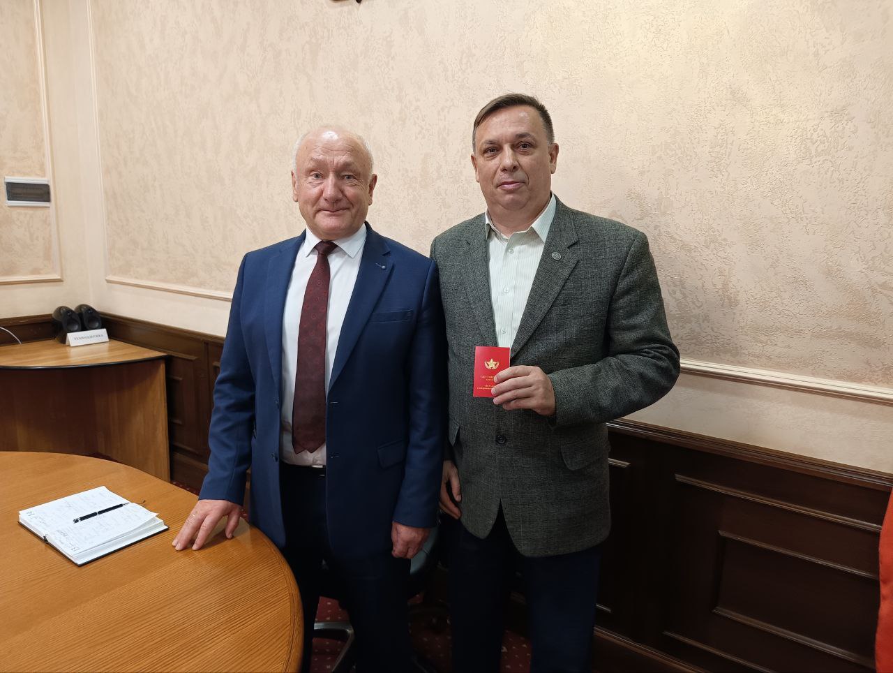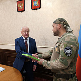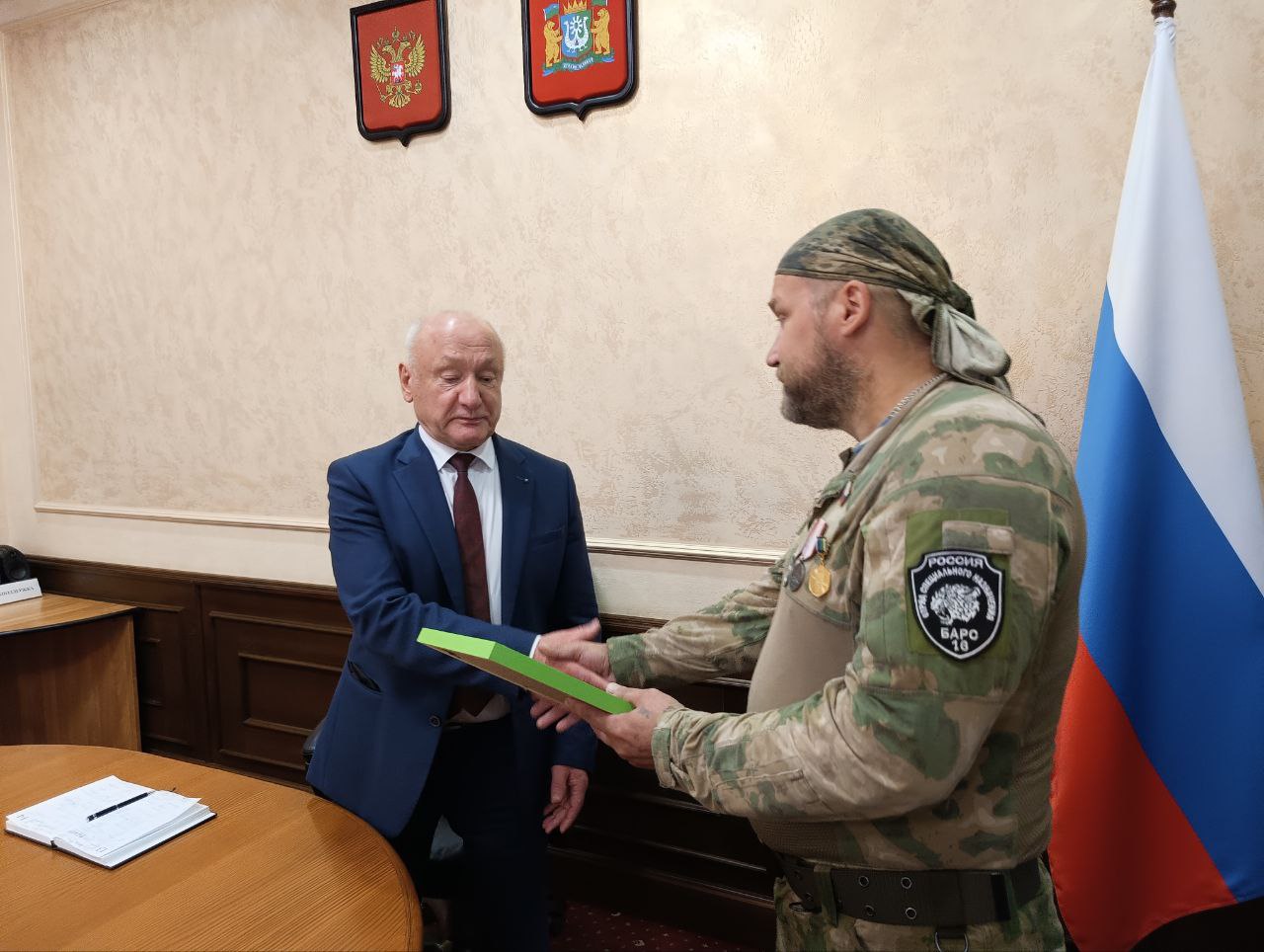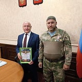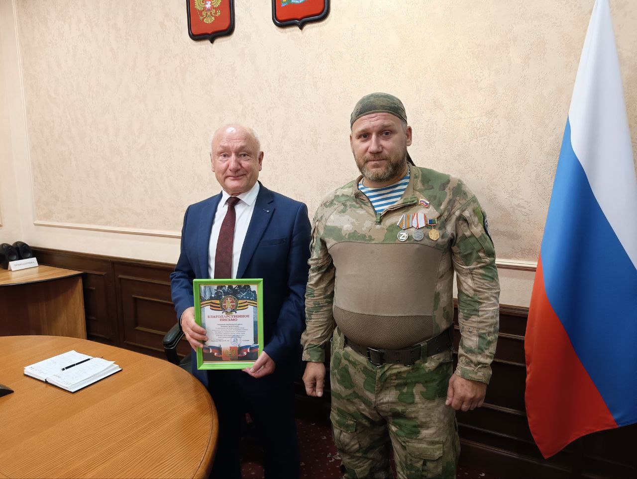 Начали заседание с приятного момента, награждений. Участник СВО Алексей Дубинин вручил Сергею Петровичу Благодарственное письмо от минометной батареи казачьего отряда специального назначения «БАРС-16» за инициативу и помощь отряду.