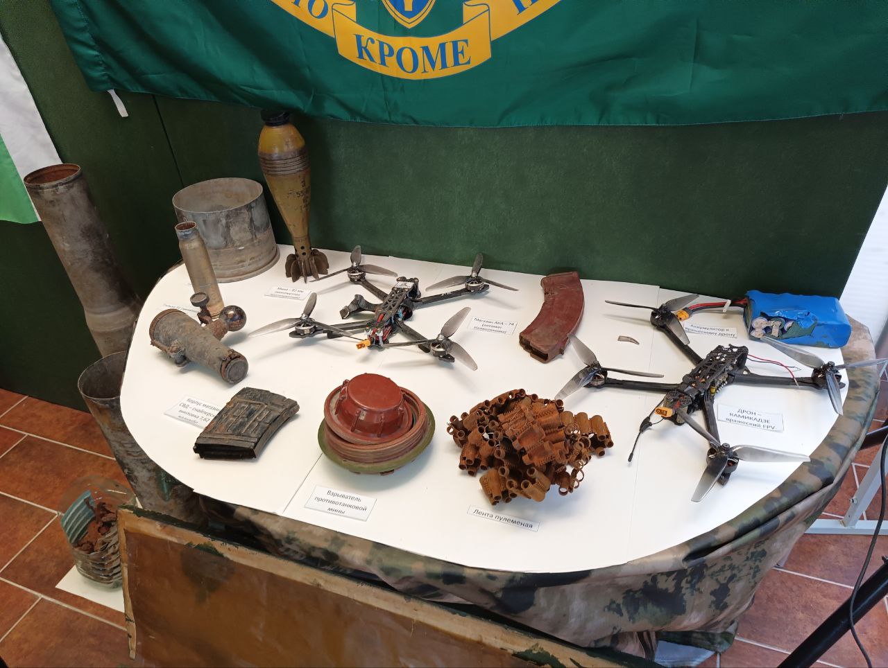 В экспозиции представлено стрелковое вооружение и снаряжение, иллюстрированное материалами о героях боевых действий со времен Великой Отечественной войны до наших дней.