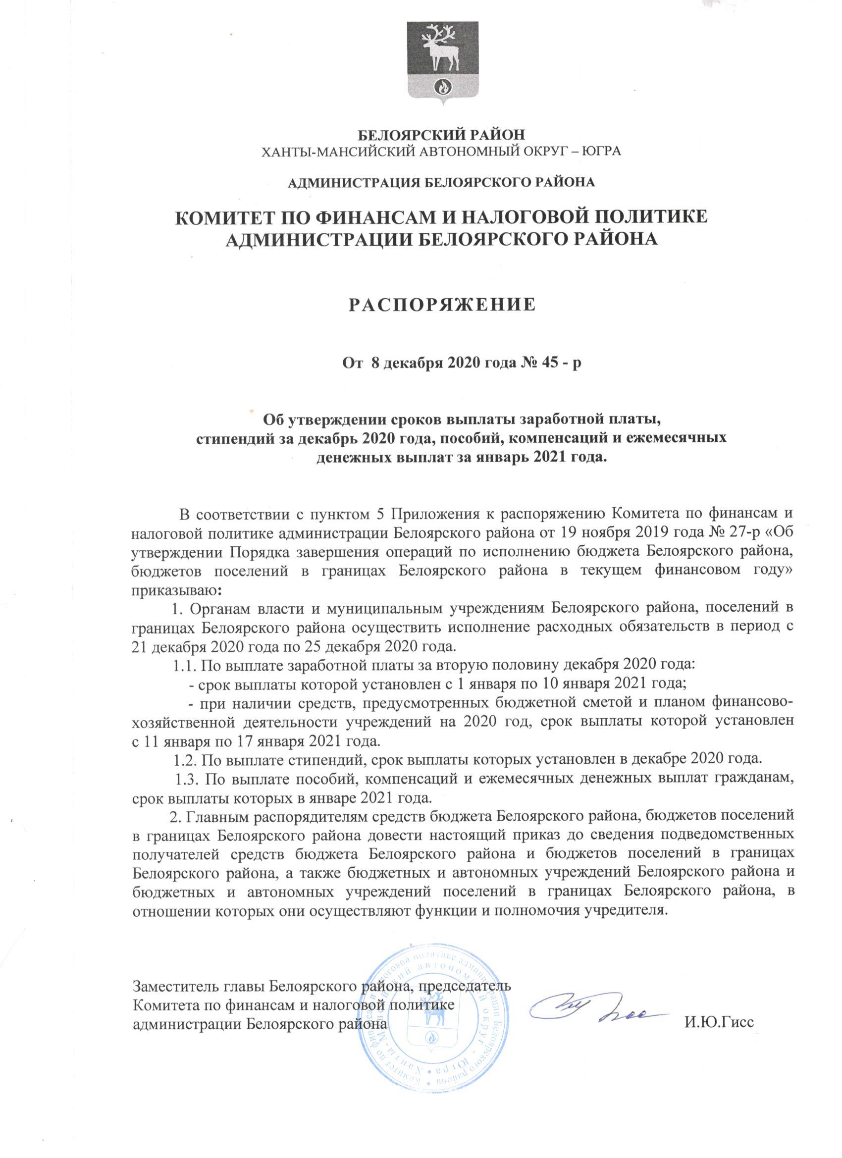 Распоряжение Комитета по финансам и налоговой политике администрации Белоярского района от 08.12.2020 № 45-р